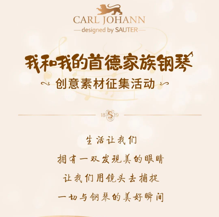 ②圖片和視頻的美感第一,但也請(qǐng)您在鏡頭中展示出SAUTER 鋼琴與Carl Johann 鋼琴的Logo且不能出現(xiàn)其他相關(guān)品牌的產(chǎn)品。